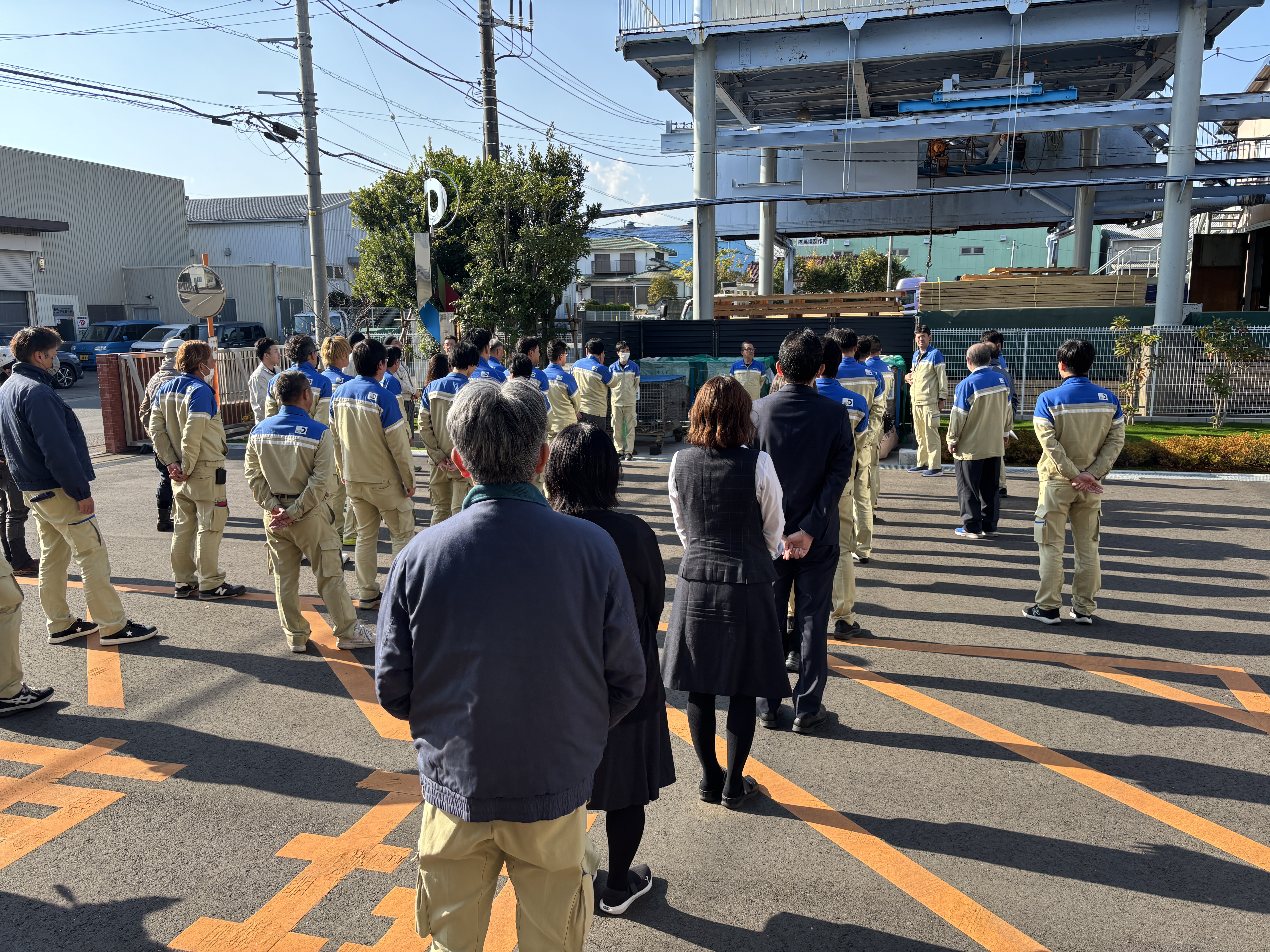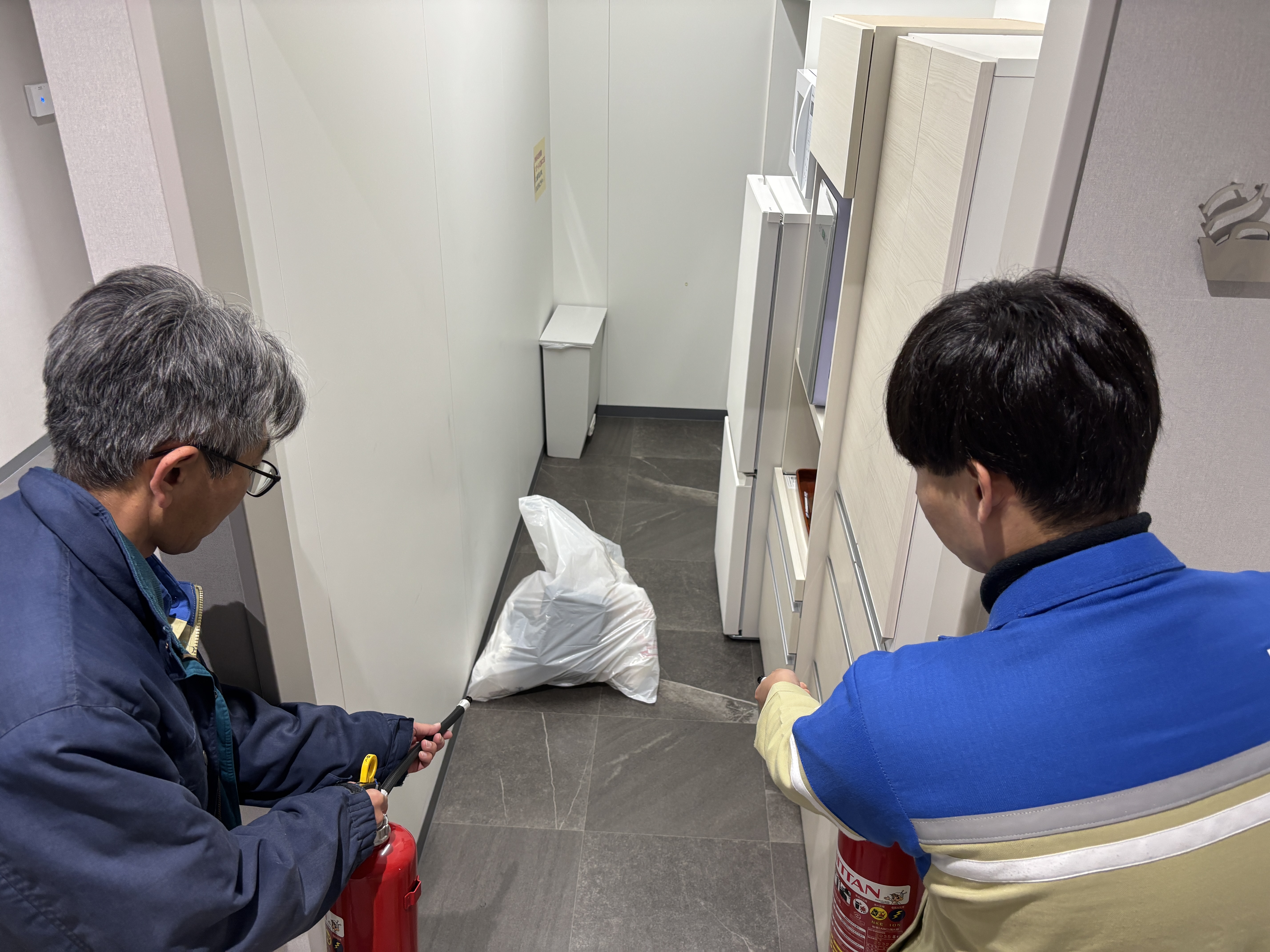 消防訓練2025 避難後集合の様子 2025年11月28日(金) 綾瀬事務所で避難訓練を行いました。 新しい事務所になって初の避難訓練になります。 館内放送装置などの社内設備を使用して緊張感のある訓練が出来たと思います。 消化班の様子 ゴミ袋を火災元と想定して訓練しています。
